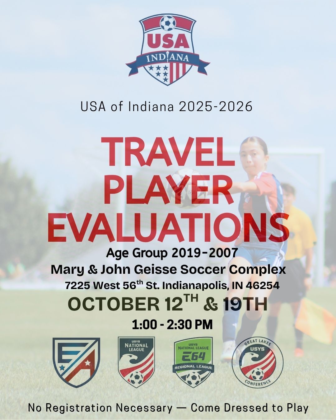 SOCCER IN THE COMMUNITY - Free Community Soccer Sessions Players Born in 2017, 2016, 2015, 2014, 2013, 2012 Friday | September 26 6:00 to 7:00 pm Friday | October 22 5:30 to 6:30 pm Mary & John Geisse Soccer Complex 7225 W. 56th Street Field 10
