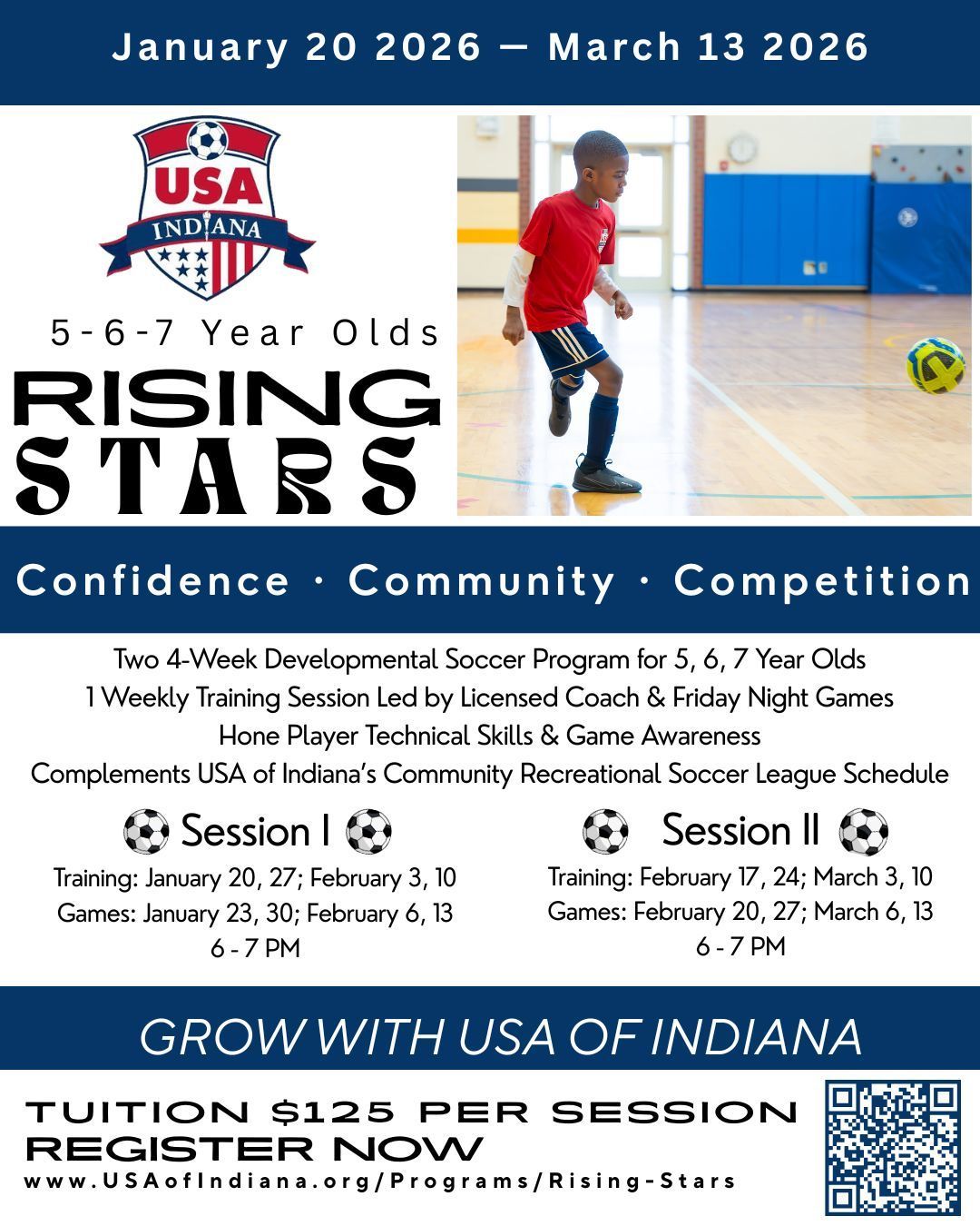 This program is ideal for both newcomers and experienced players. Participate in both USAI Community Recreational Soccer and Rising Stars to increase frequency of play and optimize player development!