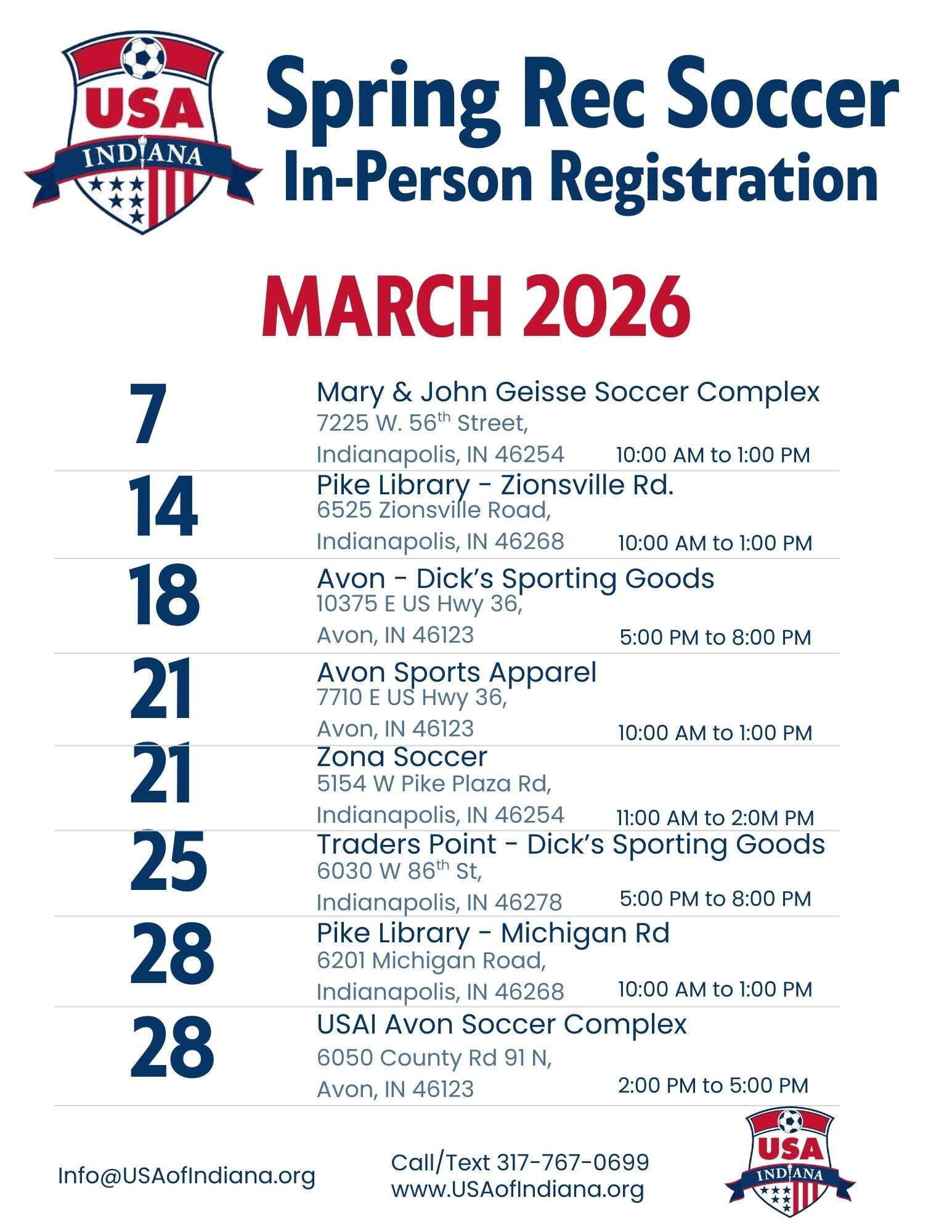 USA of Indiana Coaches Teach More Than Just The Game. They model R espect, E thics, C haracter, and C ommunity, developing fine young people through soccer. Perks You choose which time and day of the week you practice Coaching fulfills volunteer requirements for Rec player accounts Coaches have access to coaching resources, training plans, & support Official USA of Indiana coaching gear and practice materials provided Commitment Attend scheduled practices and games Choose and utilize age-appropriate practice plans from USA of Indiana's resources Support character development Communication with team Tots Coaches Tots have "Lead Parents" instead of Coaches, who help run Tots Sessions with support from the USA of Indiana Lead Coach for all 6 sessions . Rec Coach Training There will be a Rec Coach Training for both Pike and Hendricks Coaches at Mary and John Geisse Soccer Complex on March 28th, 2026 & April 4th, 2026 . To sign up to be a Community Recreational Coach, please indicate your interest on your child's registration form, click the button above, or email info@usaofindiana.org . Visit the USAI Coaching Resources page for planning information and game format!