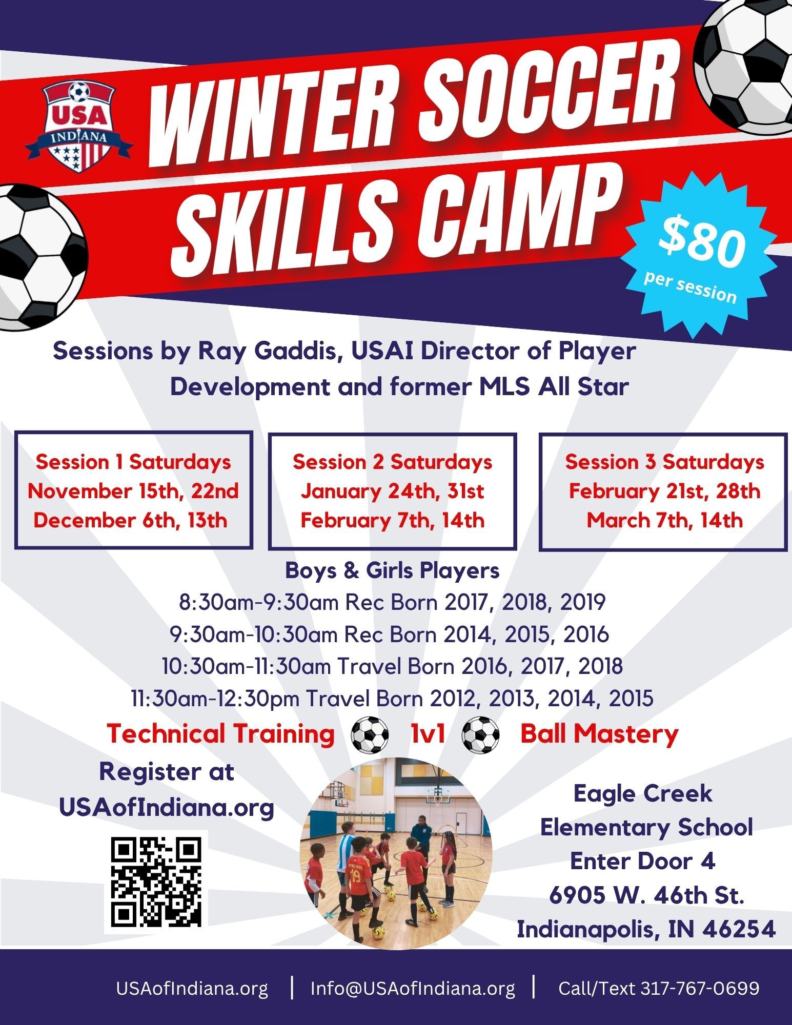 Develop your game this winter at USA of Indiana's Winter Soccer Skills Camp with Ray Gaddis, USAI Director of Player Development and former MLS ALL-Star. Focused on technical training, 1v1 competition, and ball mastery, this camp helps players build confidence and skill in a fun, engaging environment.